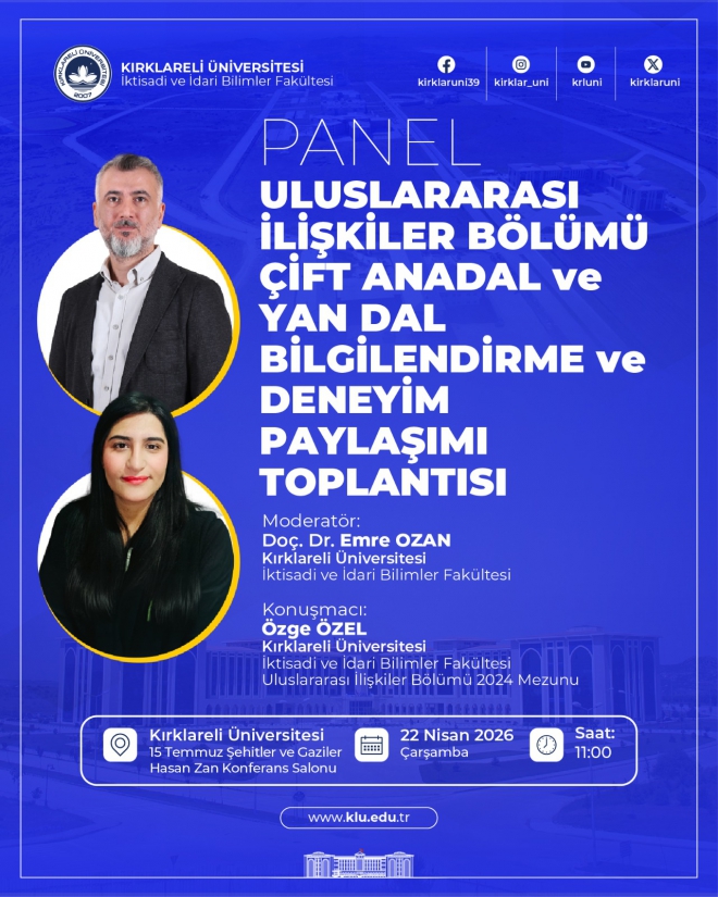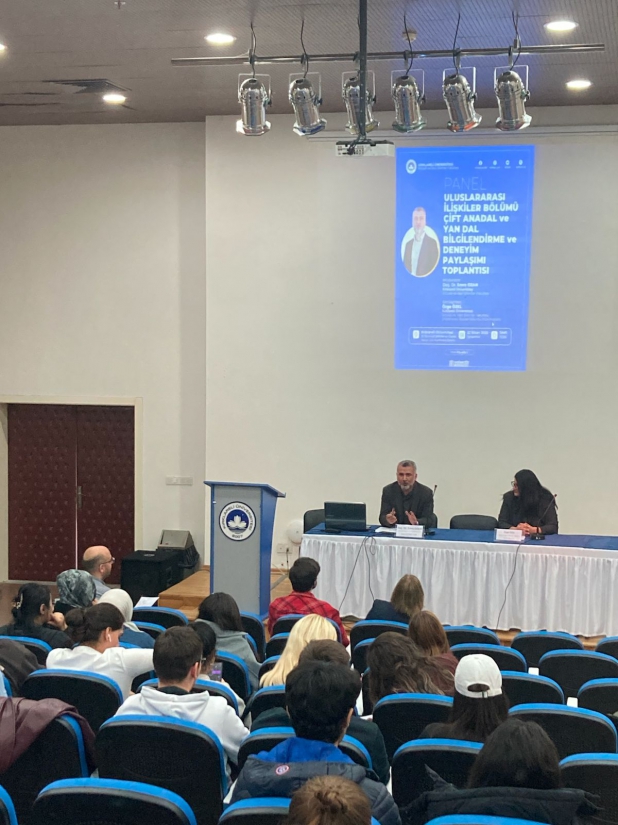 Uluslararası İlişkiler Bölümü Çift Anadal ve Yan Dal Bilgilendirme ve Deneyim Paylaşımı Toplantısı, 22 Nisan 2026 Çarşamba günü Hasan Zan Konferans Salonu'nda gerçekleştirilmiştir. Doç. Dr. Emre Ozan’ın moderatörlüğünde düzenlenen panelde, 2024 yılı mezunu Özge Özel konuşmacı olarak yer alarak akademik ve profesyonel tecrübelerini öğrencilerle paylaşmıştır. Etkinlikte, öğrencilerin kariyer yolculuklarına katkı sunacak ÇAP ve YAP programları hakkında detaylı bilgilendirmeler yapılarak süreçlerin niteliğini artıracak adımlar değerlendirilmiştir.